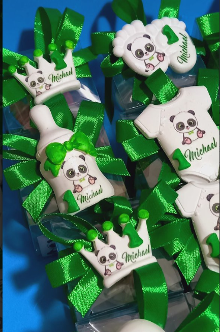 Bomboniera primo compleanno bimbo animali panda orsetto numero uno corona biberon body palloncino piedini calamita magnete